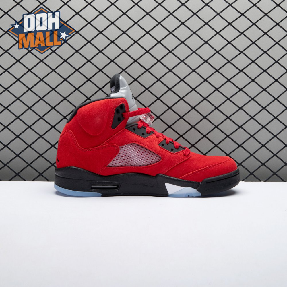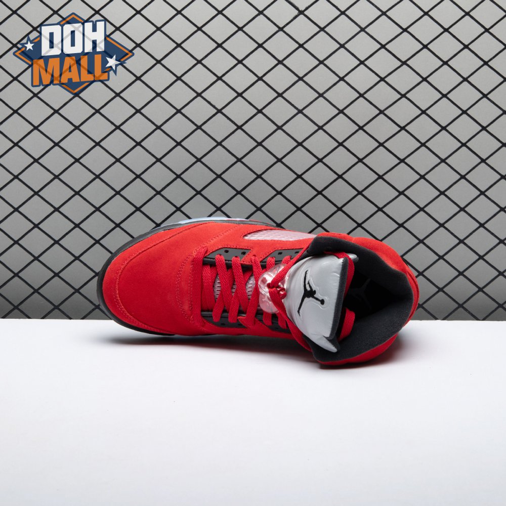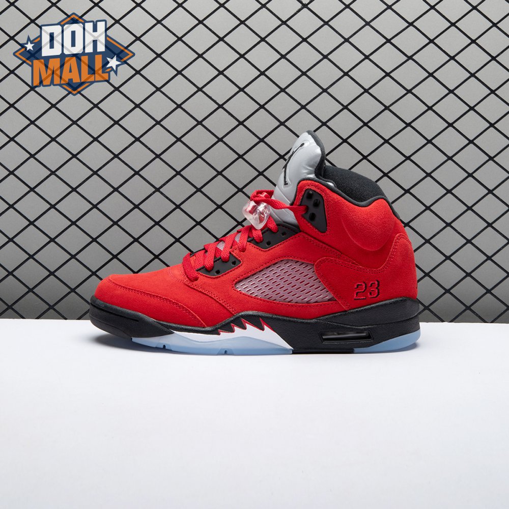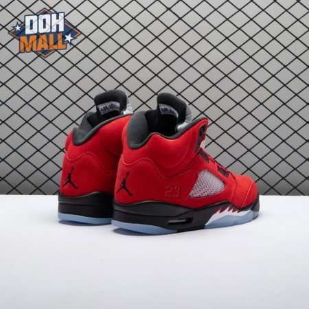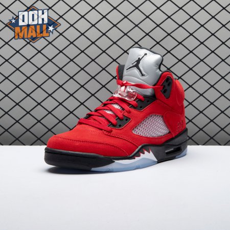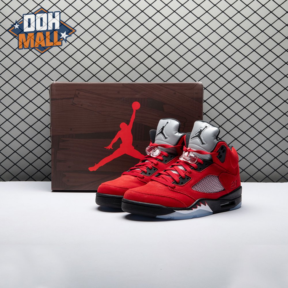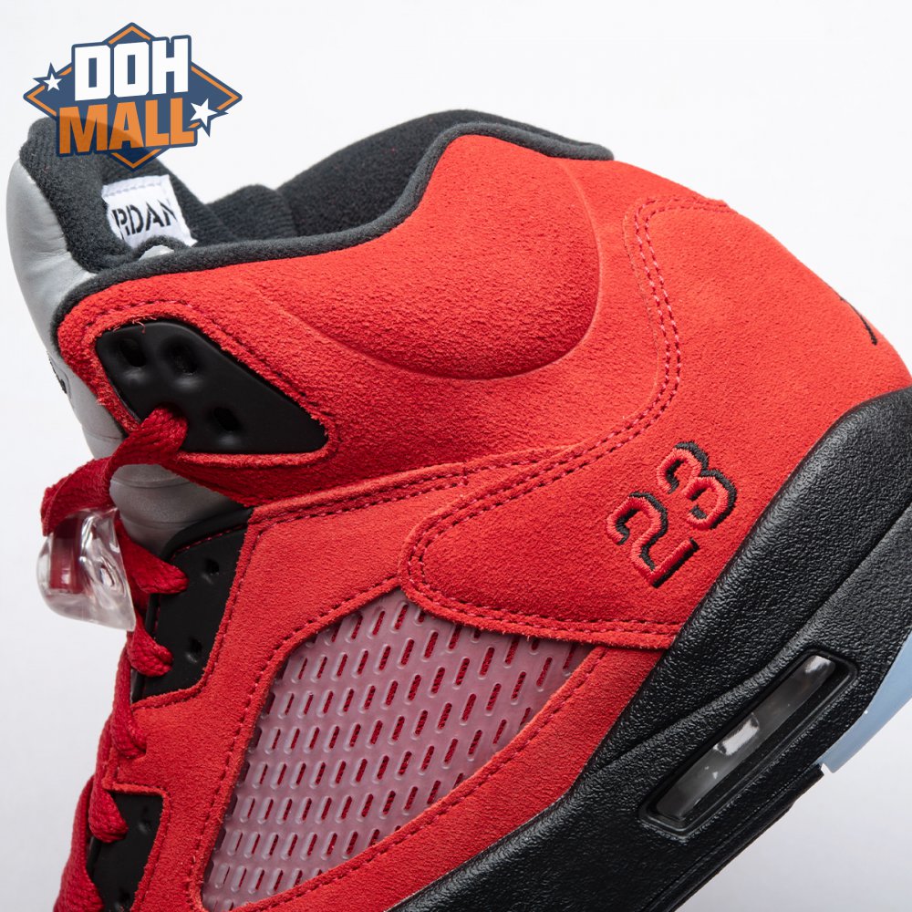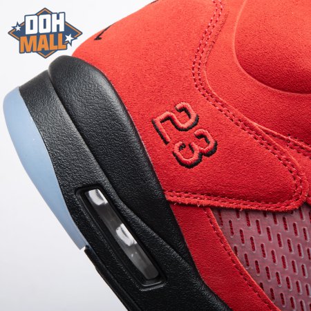The 2021 reissue of the Air Jordan 5 Retro "Raging Bull" brings back a beloved colorway originally released as one-half of 2009"s Air Jordan 5 Raging Bulls Pack. The shoe"s defining feature is a plush Varsity Red suede upper, equipped with black eyelets and a Jumpman-branded reflective silver tongue. The heel overlay displays a second Jumpman logo and an embroidered 23 on the lateral side. A visible Nike Air heel unit enhances the polyurethane midsole, accented with red-tipped shark tooth detailing and supported by an icy translucent outsole.