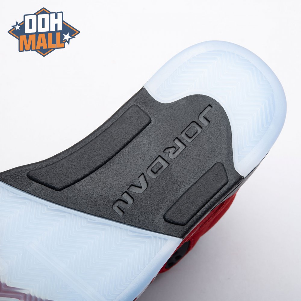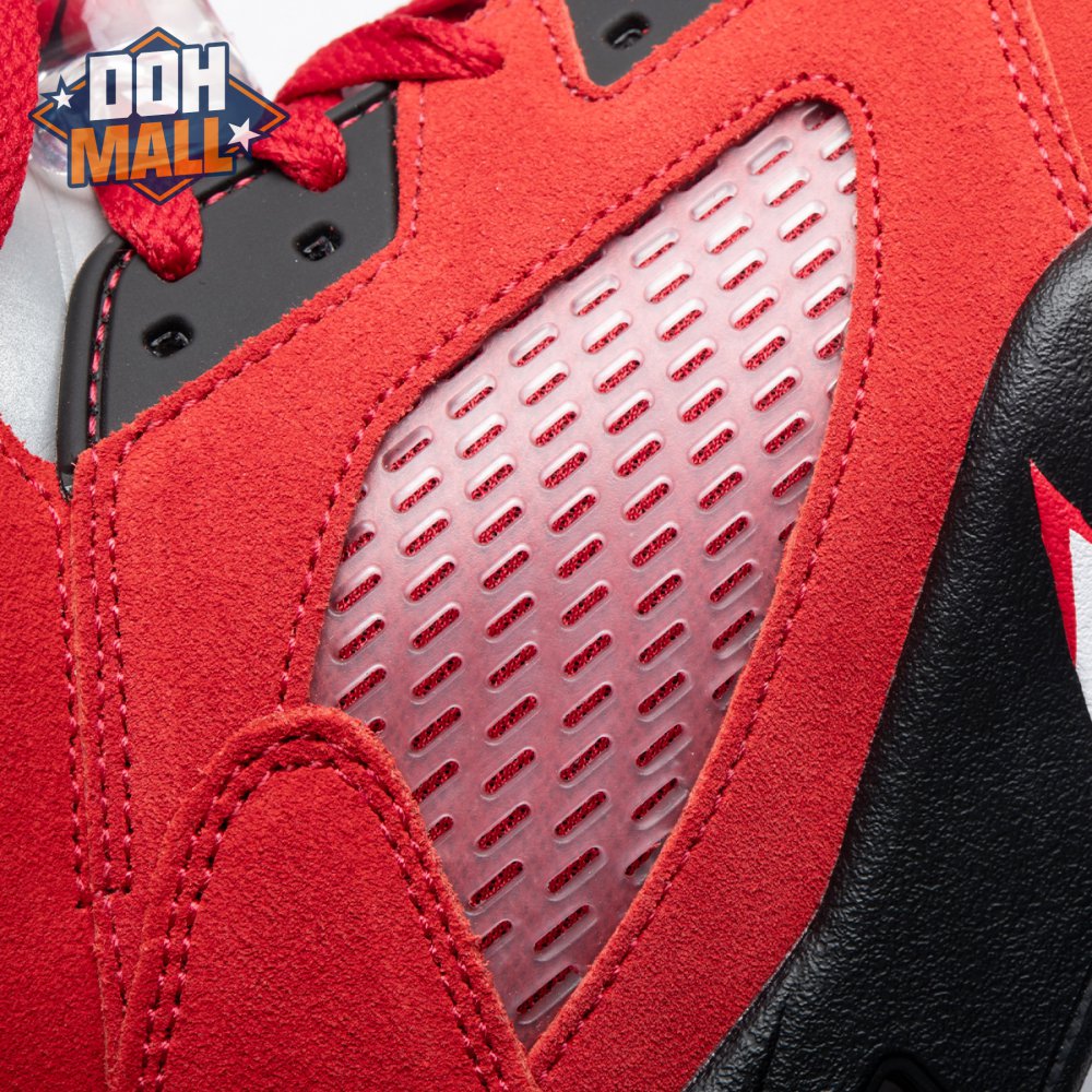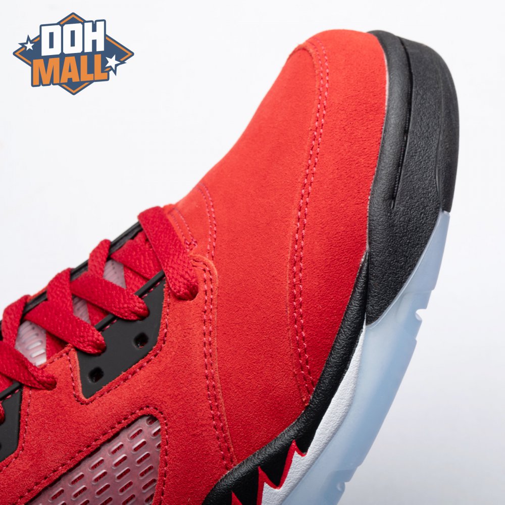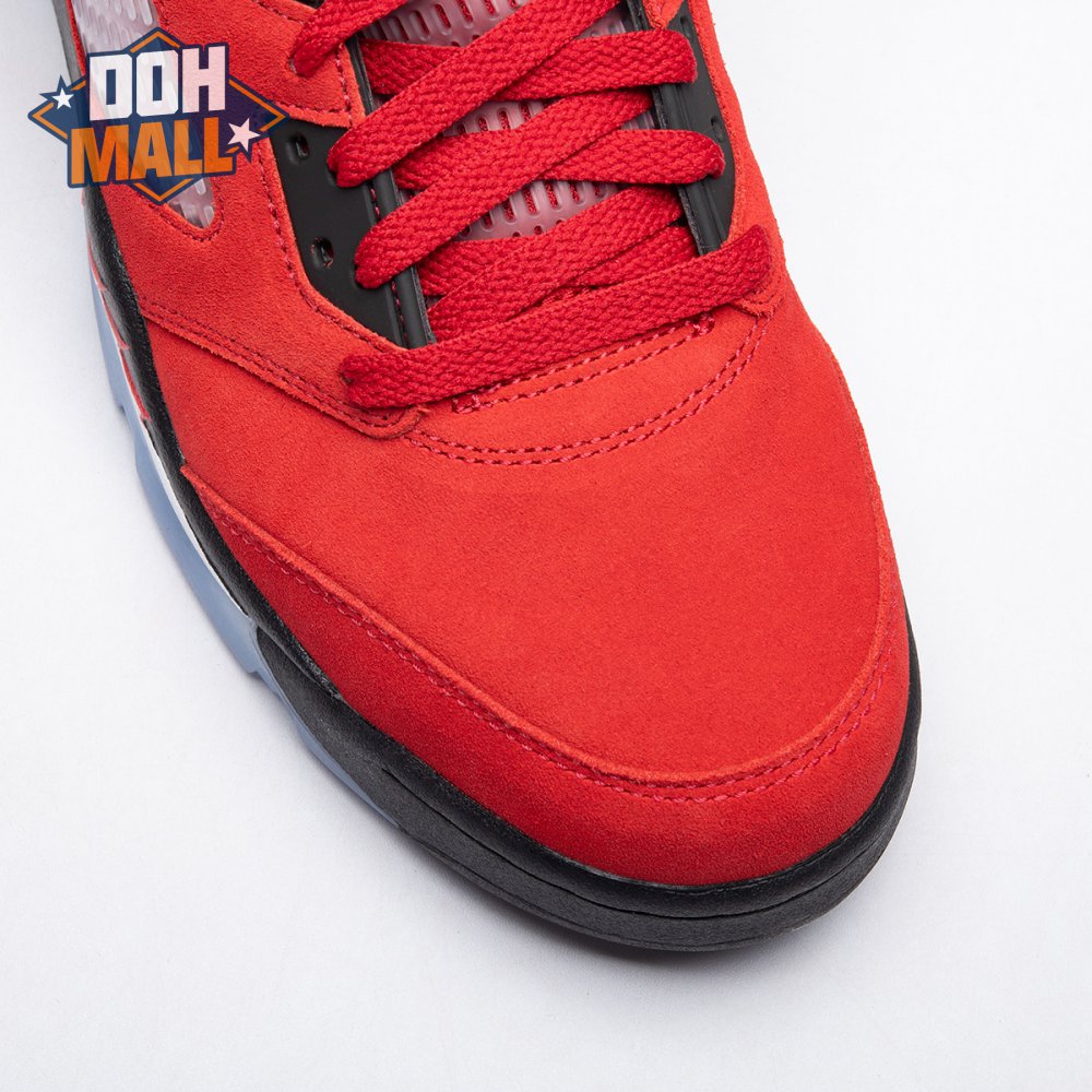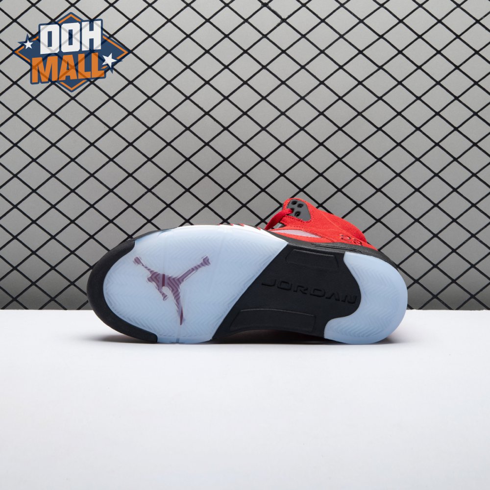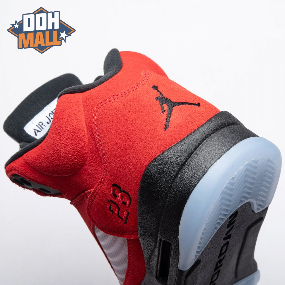 The 2021 reissue of the Air Jordan 5 Retro "Raging Bull" brings back a beloved colorway originally released as one-half of 2009"s Air Jordan 5 Raging Bulls Pack. The shoe"s defining feature is a plush Varsity Red suede upper, equipped with black eyelets and a Jumpman-branded reflective silver tongue. The heel overlay displays a second Jumpman logo and an embroidered 23 on the lateral side. A visible Nike Air heel unit enhances the polyurethane midsole, accented with red-tipped shark tooth detailing and supported by an icy translucent outsole.
