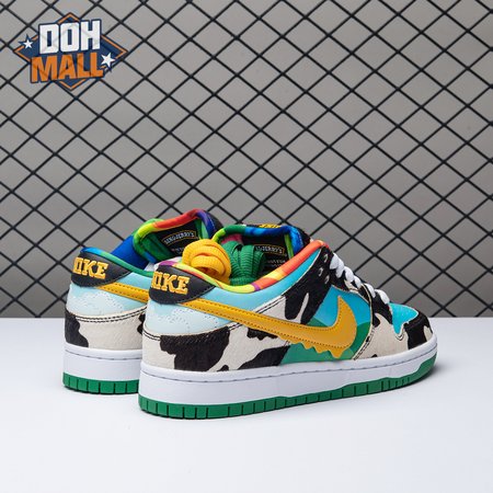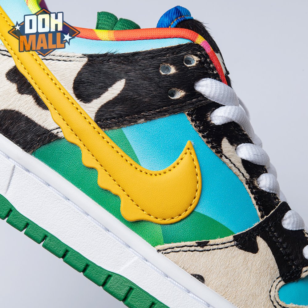 Made in collaboration with Ben & Jerry"s, the Nike Dunk Low SB "Chunky Dunky" replicates the packaging used for the ice cream brand"s Chunky Monkey flavor. The leather upper depicts blue skies and green pastures, while pony-hair overlays are rendered in a spotted cow print. A yellow leather Swoosh is treated to a melting ice cream effect for added visual flair. Atop the tongue, the woven tag features a Chunky Dunky callout alongside Nike SB branding.