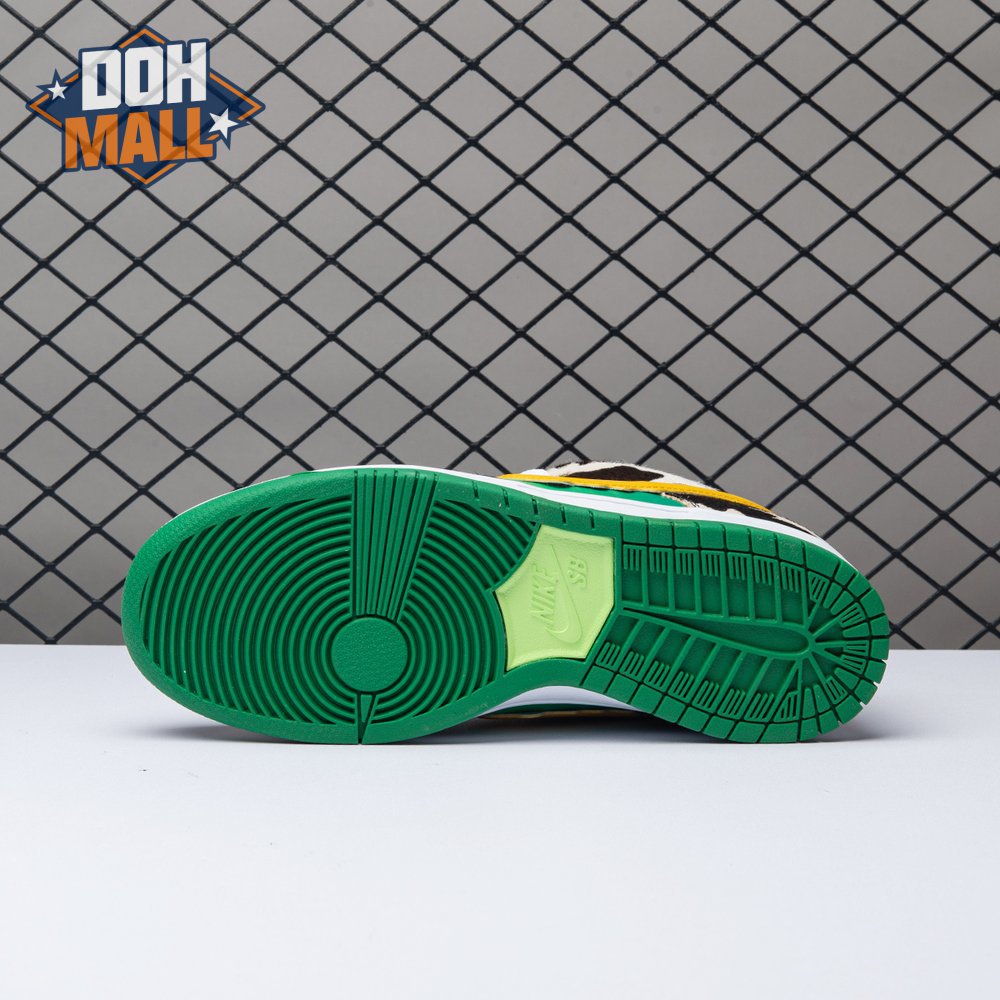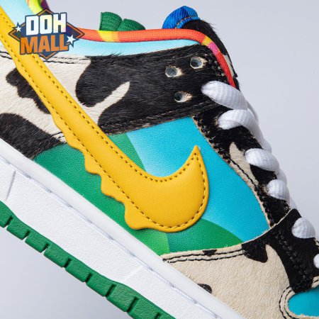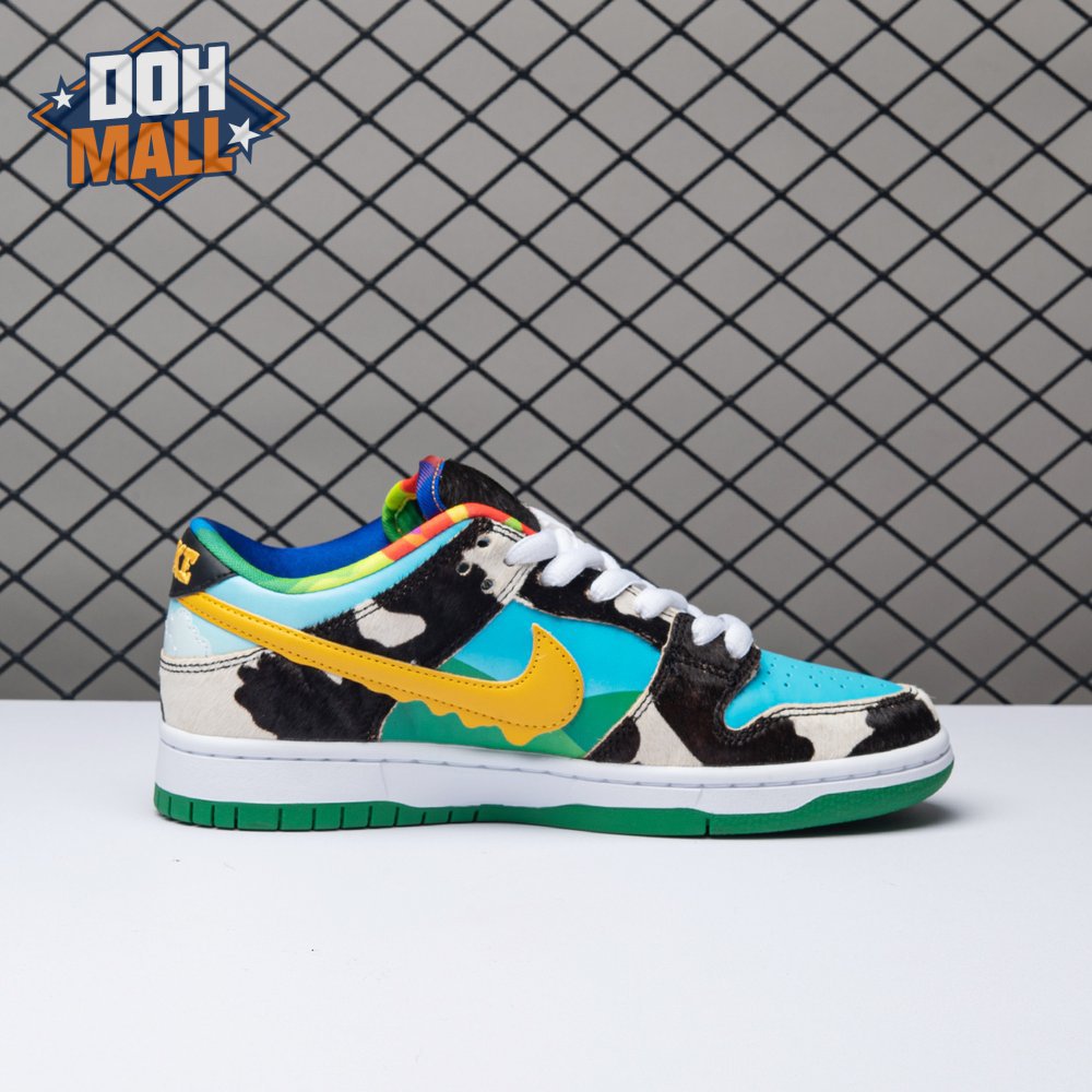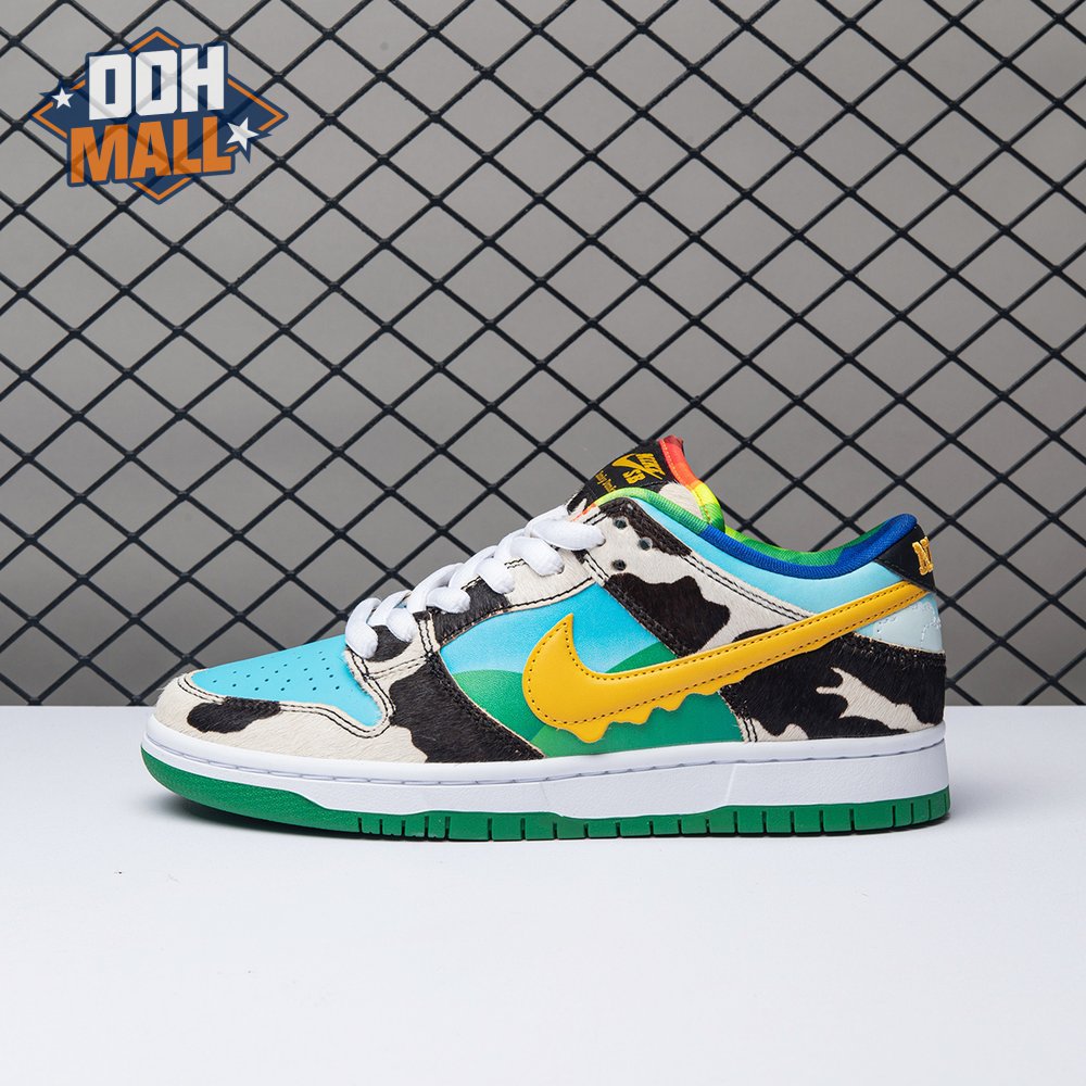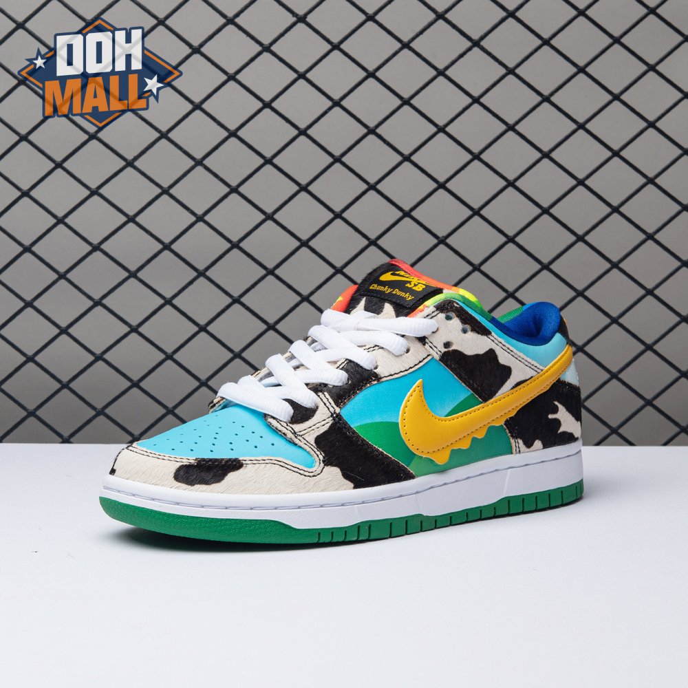Made in collaboration with Ben & Jerry"s, the Nike Dunk Low SB "Chunky Dunky" replicates the packaging used for the ice cream brand"s Chunky Monkey flavor. The leather upper depicts blue skies and green pastures, while pony-hair overlays are rendered in a spotted cow print. A yellow leather Swoosh is treated to a melting ice cream effect for added visual flair. Atop the tongue, the woven tag features a Chunky Dunky callout alongside Nike SB branding.