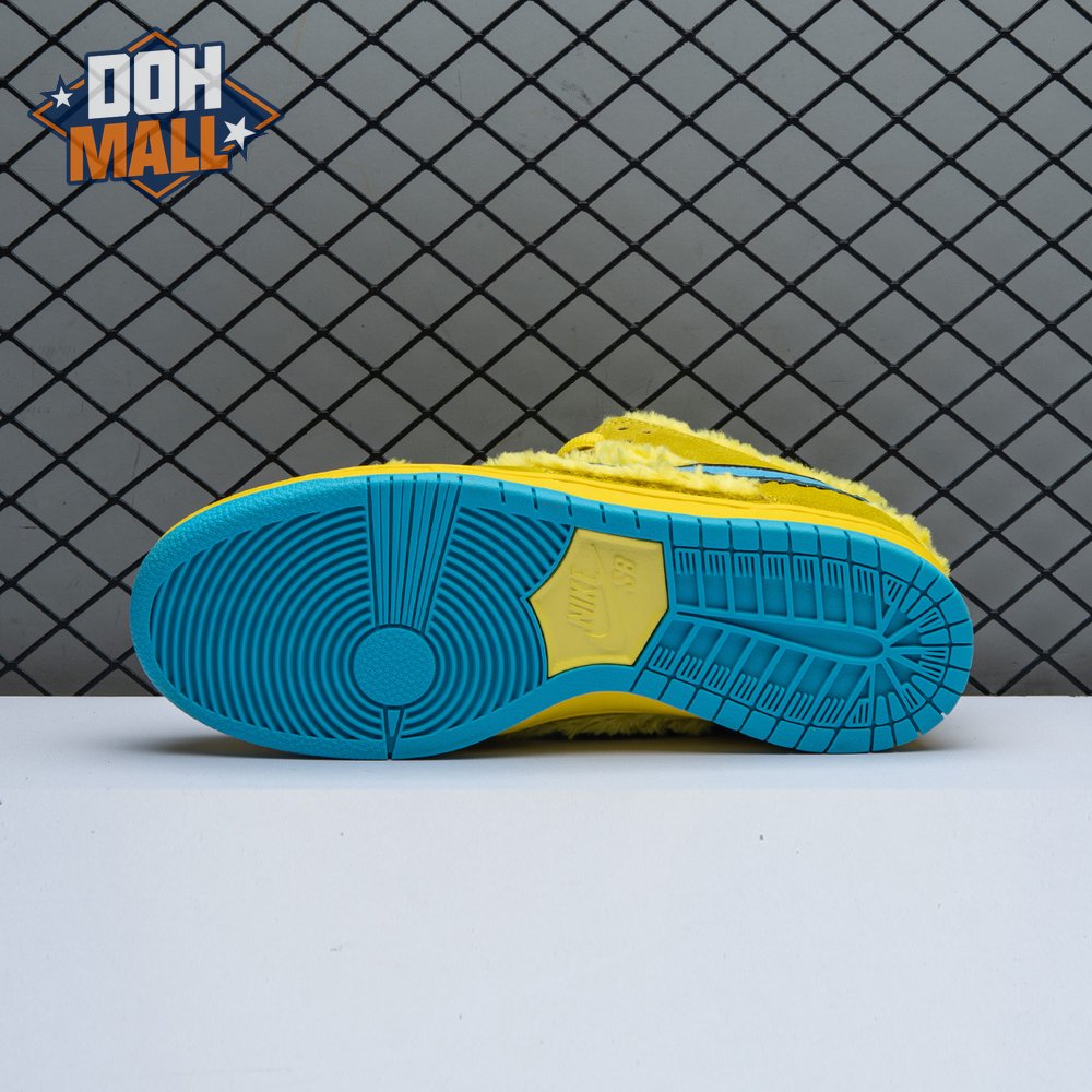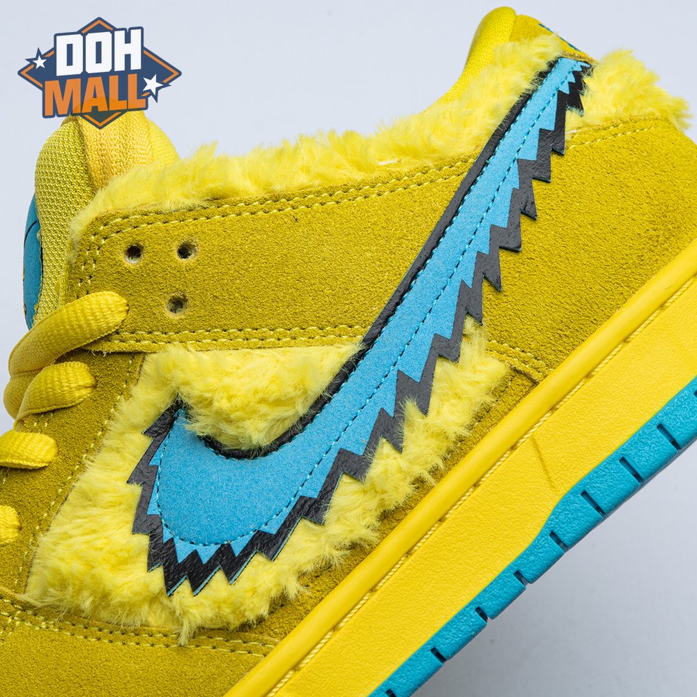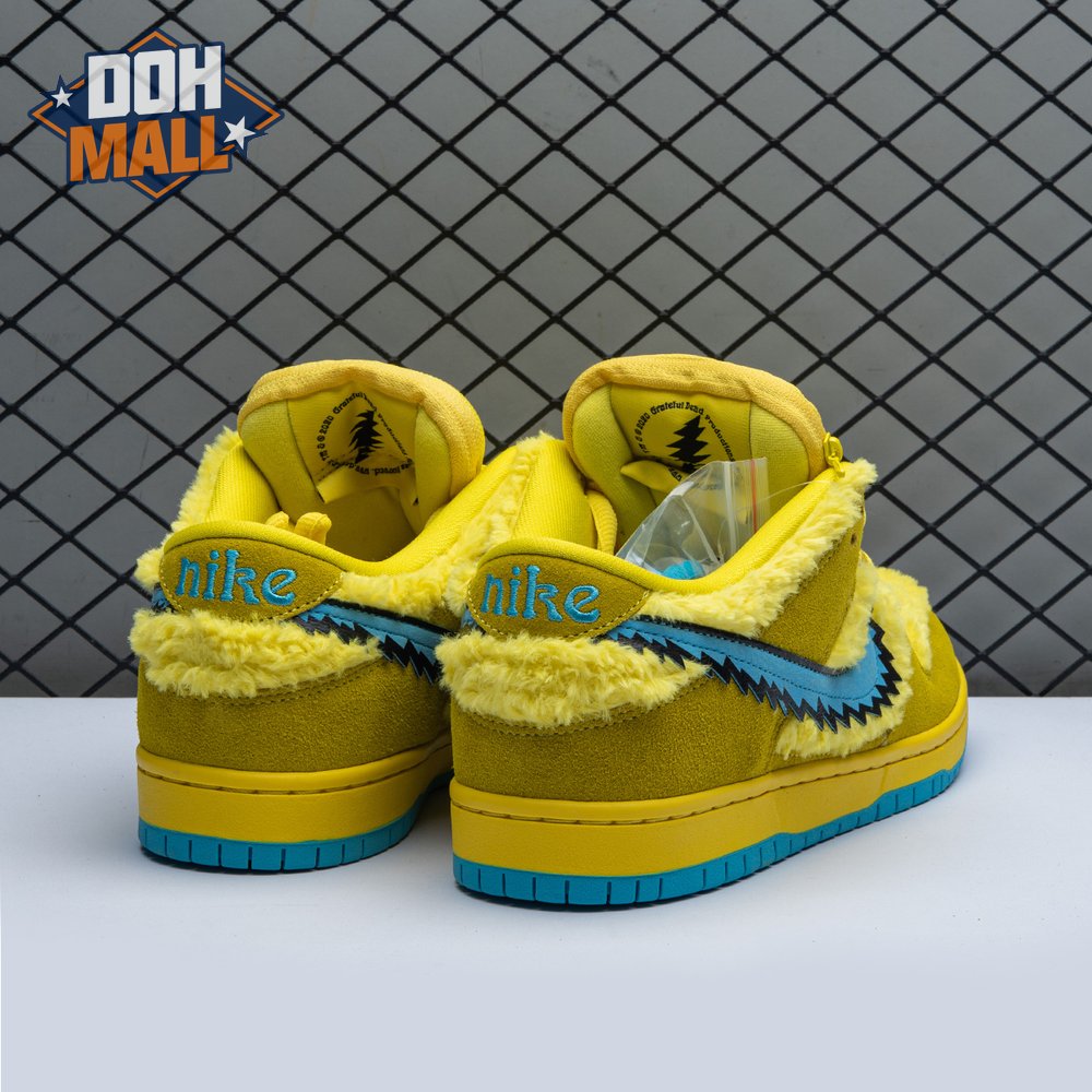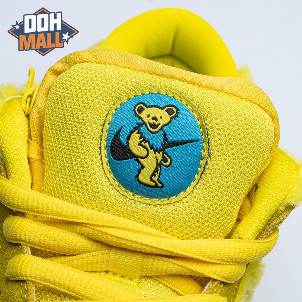 Developed in collaboration with the iconic San Francisco jam band, the Grateful Dead x Nike Dunk Low SB "Yellow Bear" features a unique design inspired by the back cover of "History of the Grateful Dead, Volume One (Bear"s Choice)," a live album originally released in 1973. A vibrant yellow finish is applied to the furry upper, fortified with tonal suede overlays and mounted atop a matching yellow foam midsole. Contrasting blue hits appear on the jagged Swoosh, rubber outsole and tongue, the latter furnished with a hidden stash pocket.