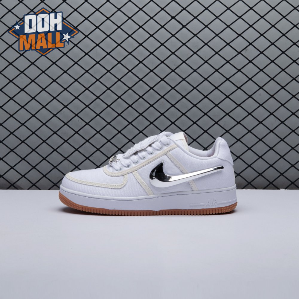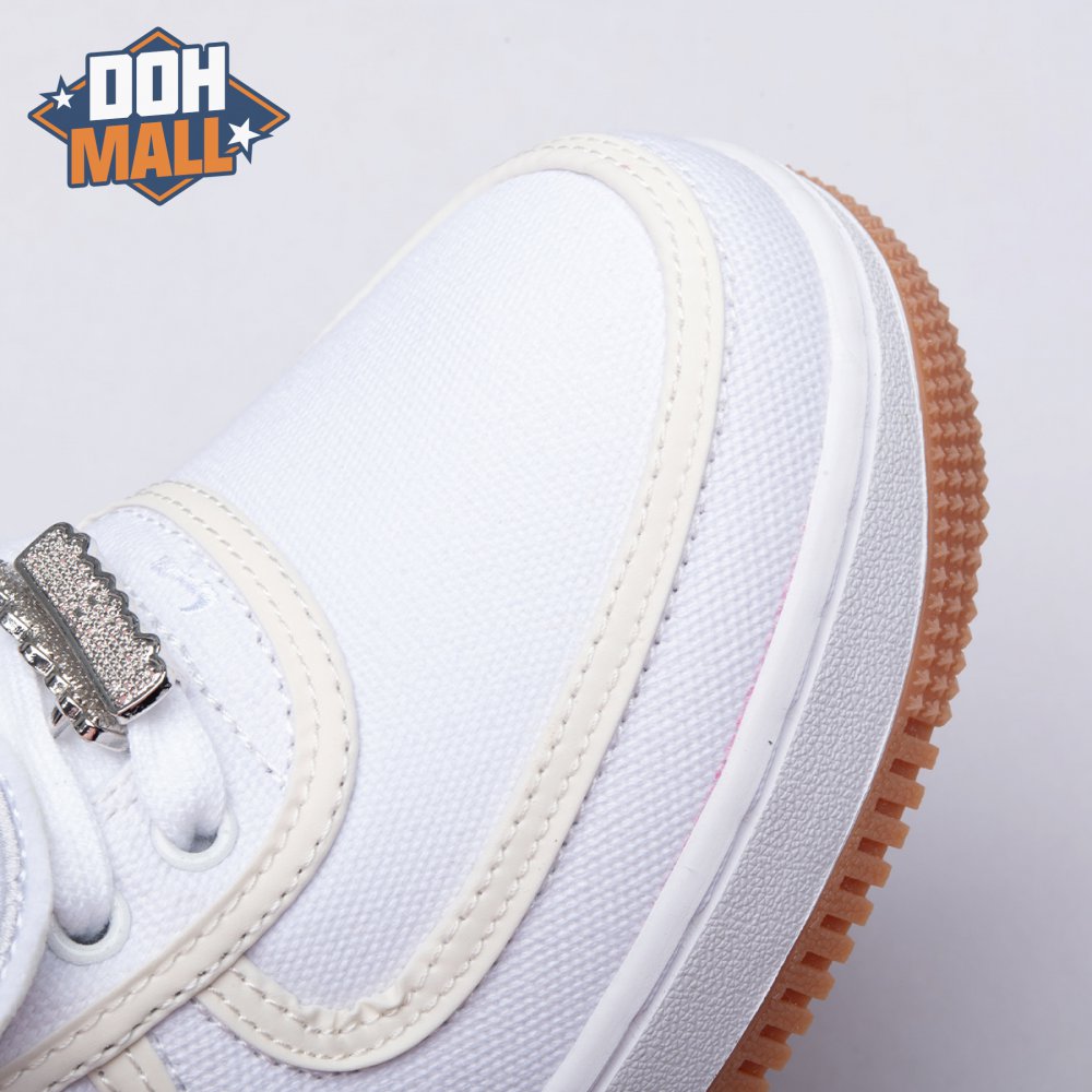 This Air Force 1 designed by Travis Scott dropped at ComplexCon 2017 in celebration of the silhouette"s 35th anniversary. The shoe features a white canvas upper with a reflective trim, white midsole, and a classic gum rubber outsole. It also comes with a upside down Nike Air branding on the heel and a customizable Velcro Swoosh and patches. The Nike Air Force 1 AF100 pack also included an Air Force 1 Low by Virgil Abloh, a Lunar Force 1 by Acronym, an Air Force 1 High by Don C, and an Air Force 1 Low by Roc-A-Fella. The pack received a wider release in December of 2017.