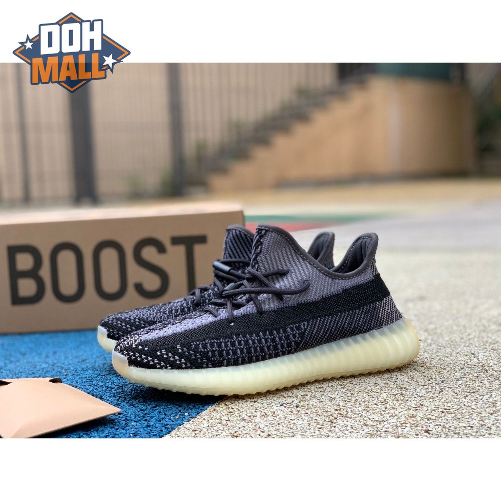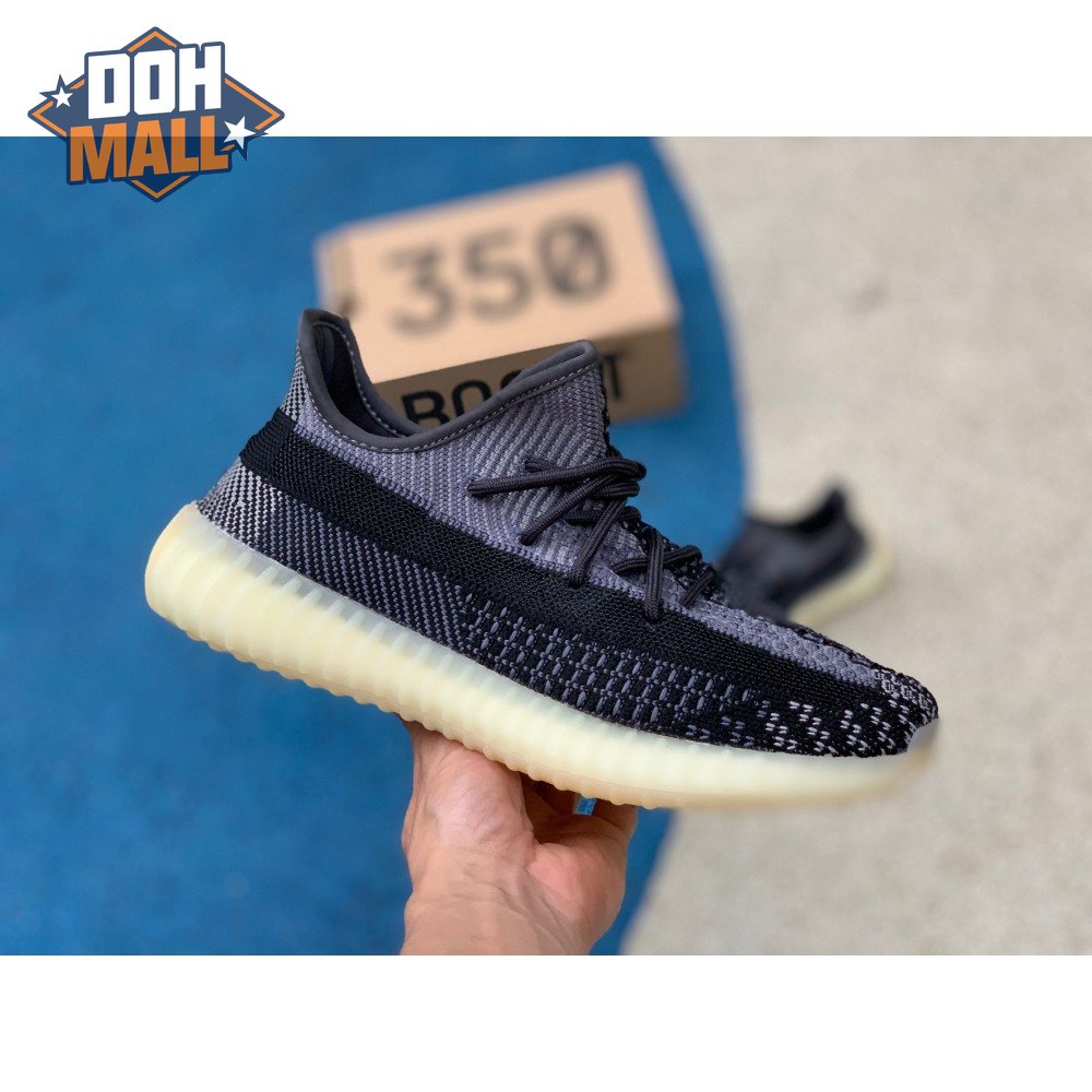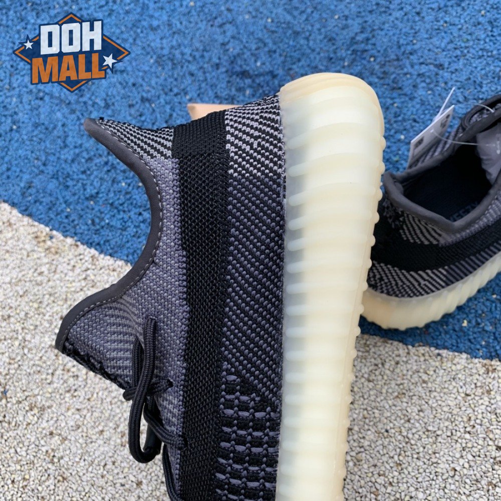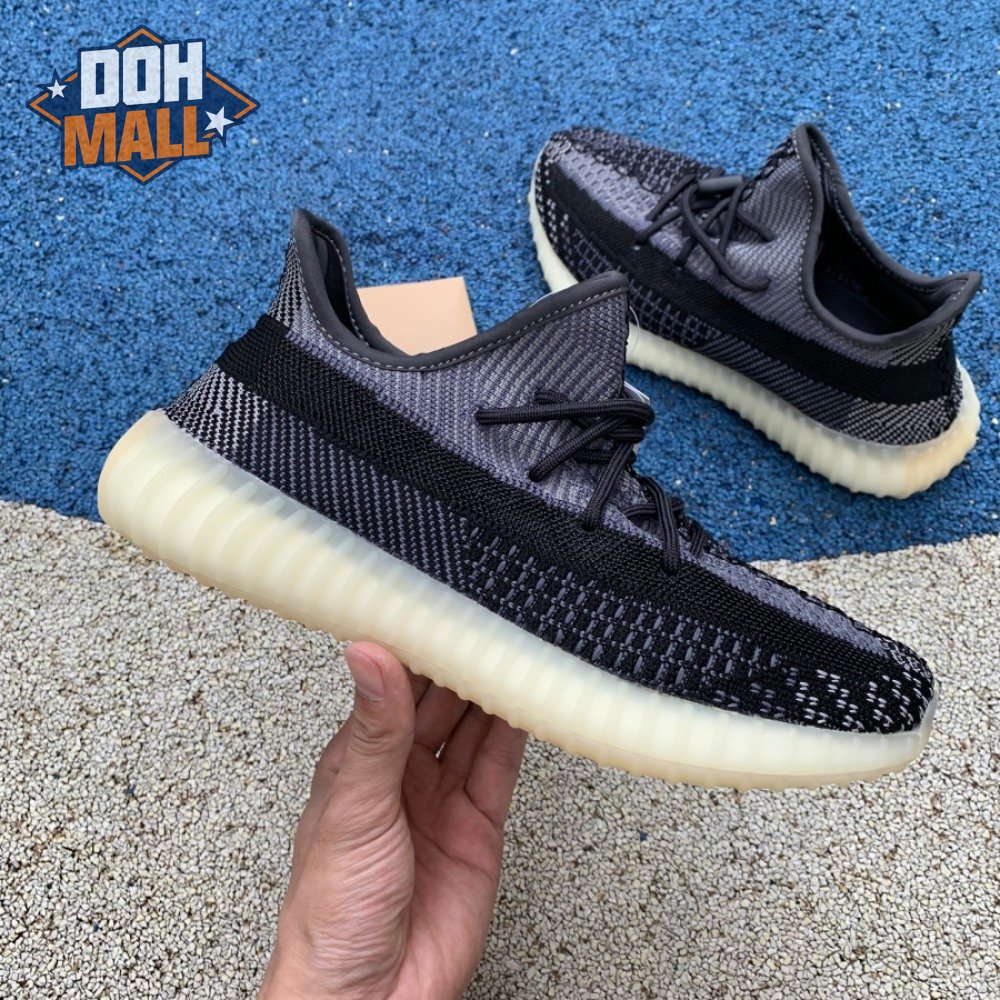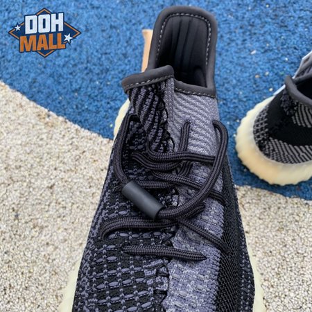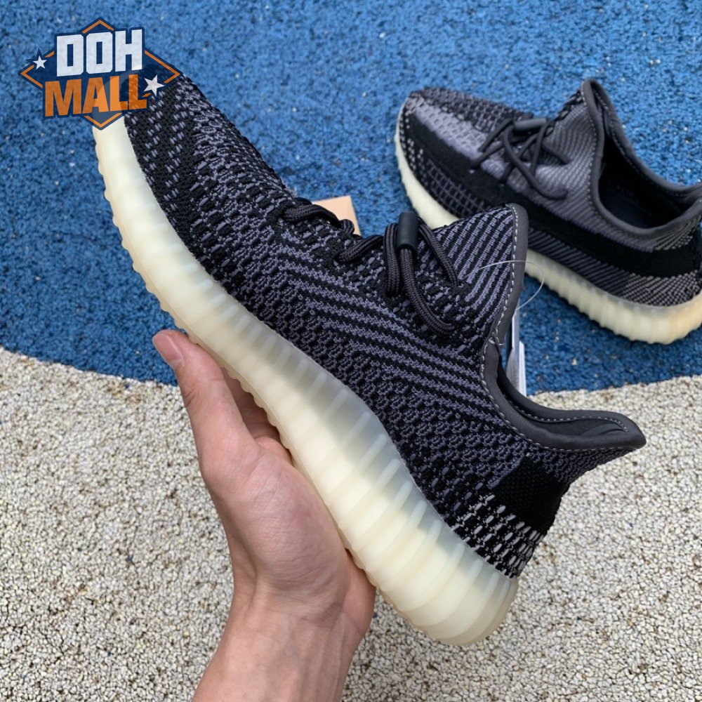 The adidas Yeezy Boost 350 V2 "Carbon" features a breathable Primeknit upper in a neutral black and grey finish. The sneaker"s lateral side features a streak of black via the post-dyed monofilament side stripe, separating a light grey weave up top with mostly black construction on the lower half. No-tie bungee laces deliver a secure fit. The sneaker rides on a full-length Boost midsole, surrounded by a yellow-tinged rubber cage.