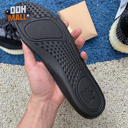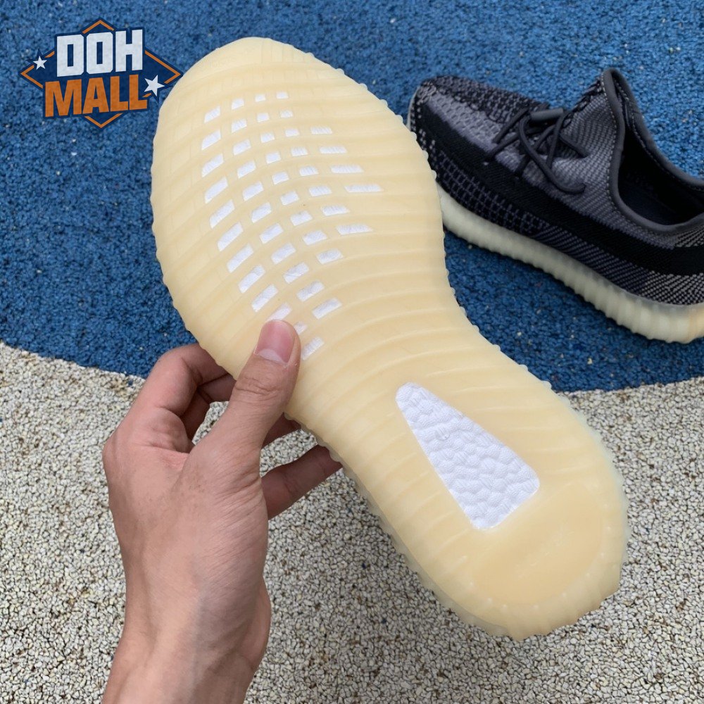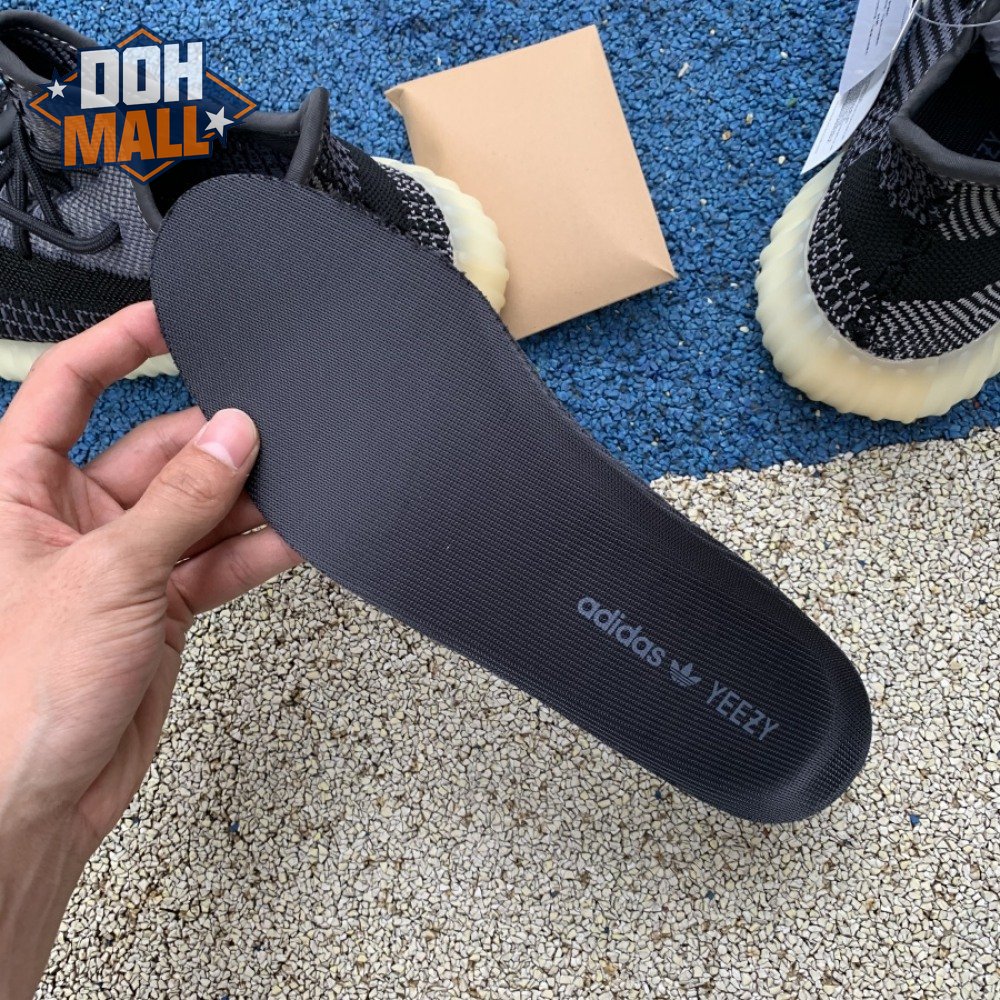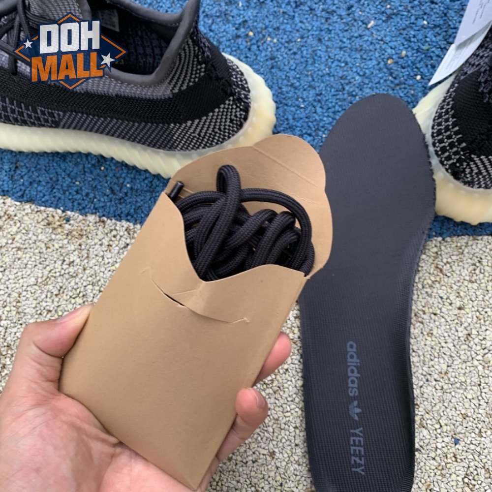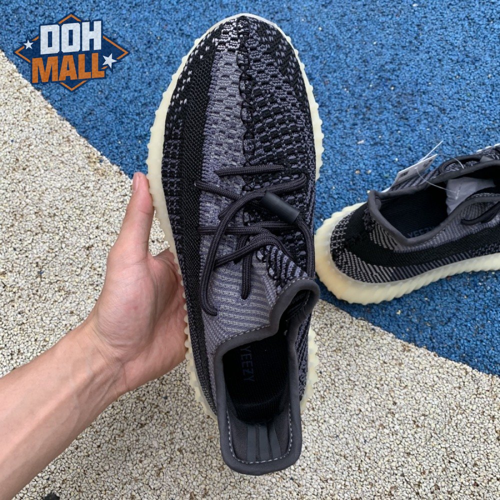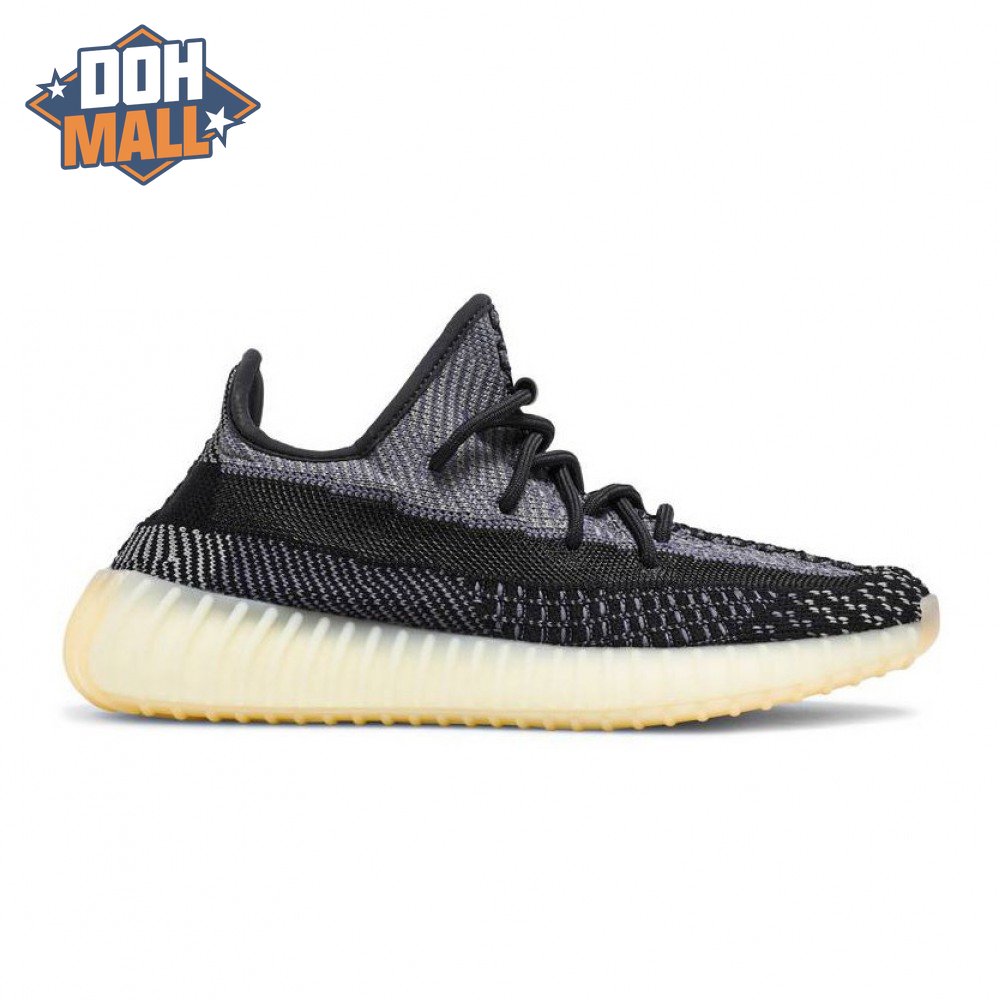 The adidas Yeezy Boost 350 V2 "Carbon" features a breathable Primeknit upper in a neutral black and grey finish. The sneaker"s lateral side features a streak of black via the post-dyed monofilament side stripe, separating a light grey weave up top with mostly black construction on the lower half. No-tie bungee laces deliver a secure fit. The sneaker rides on a full-length Boost midsole, surrounded by a yellow-tinged rubber cage.